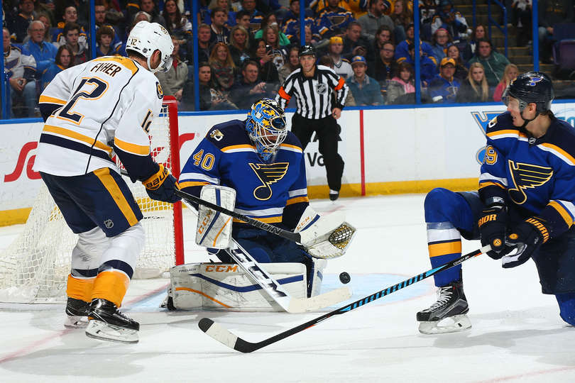 Blues goalie Carter Hutton makes a save in front of Nashville's Mike